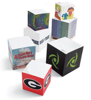 Item Description Made in the USA. Adhesive backing on note cube is repositionable. We have an eco-friendly paper option; white 100% post-consumer recycled material. Eco option is an additional price. Please call for pricing details. Silk-screen or full-color for edge printing.